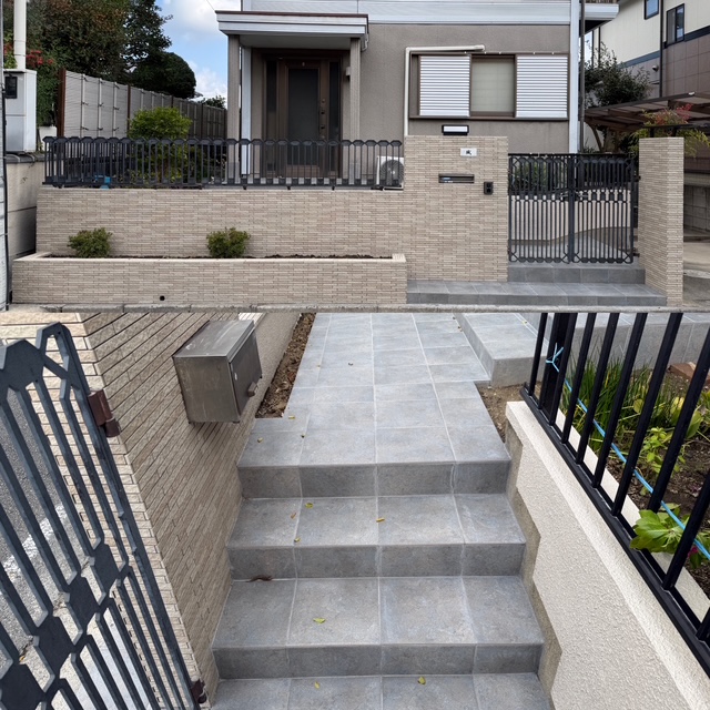 玄関アプローチと壁面のタイル張替えのご依頼です。素材感と色合いが美しく調和した、ナチュラルモダンで上品な仕上がりとなりました。